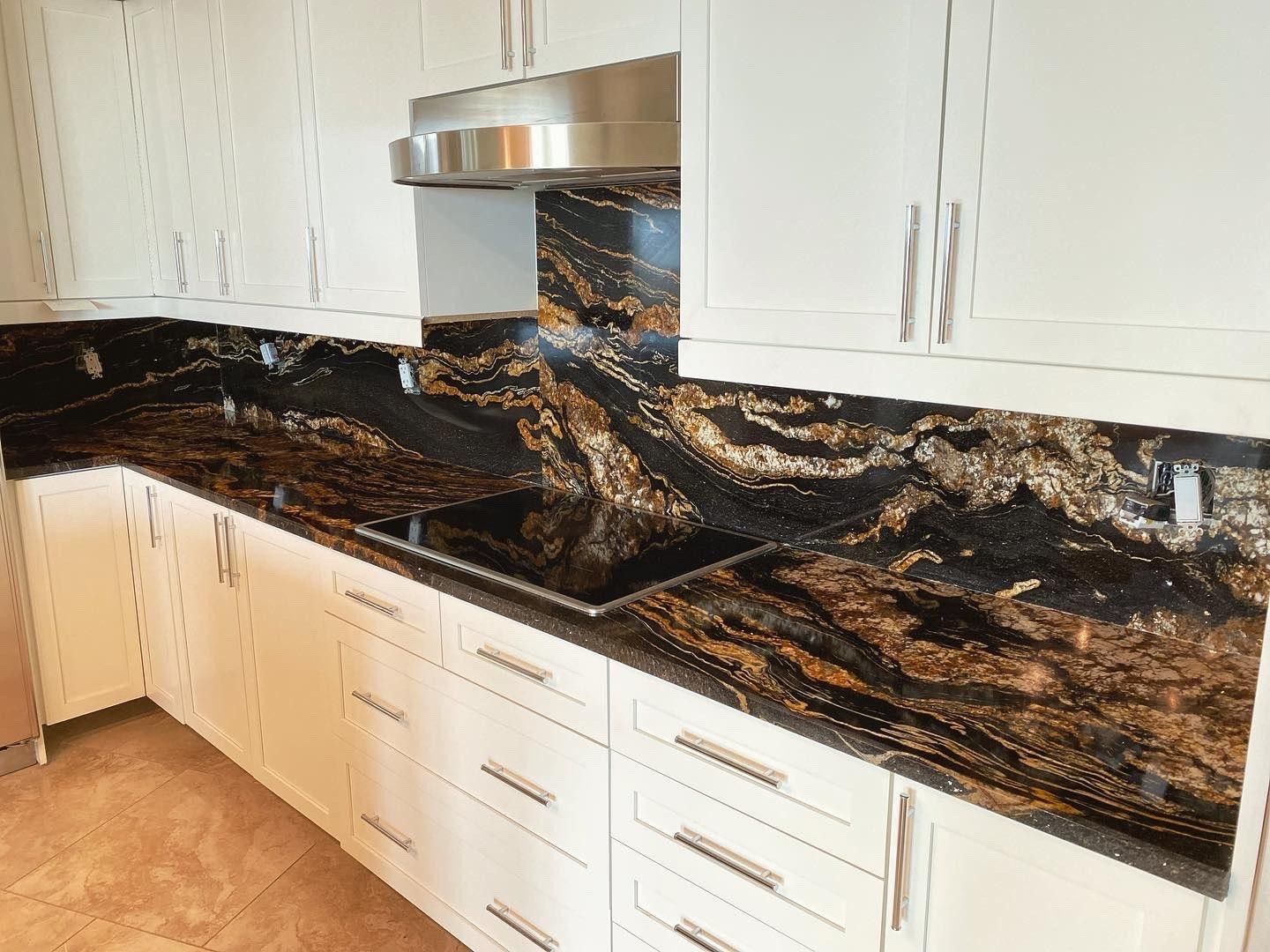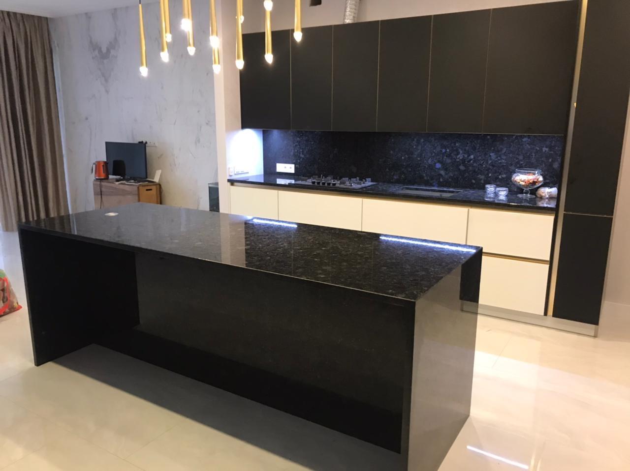 Столешница из черного гранита подойдет практически к любому интерьеру — от классического до современного. И главная особенность в том, что у каждого изделия уникальный рисунок, созданный самой природой. Если купите такой камень, получите оригинальное пространство с ярким акцентом.